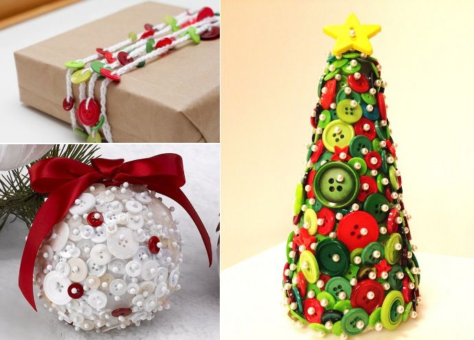 Las bolas de Navidad son un elemento fundamental en todos los árboles y se pueden hacer de materiales reciclados. Uno de los materiales fáciles de acceder son los botones. Utiliza una esfera que tengas en casa y adórnala con botones de colores que no utilices, pegándolos en la superficie. Puedes combinar los colores o hacerlas de un solo color.